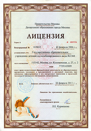 Лицензия на право осуществления образовательной деятельности А 180724, pегистрационный номер 019652 от 22.02.2006