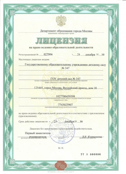 Лицензия — Номер 000806, серия 77, регистрационный номер 027906. Действительна с 21.12.2010 по 21.12.2016.